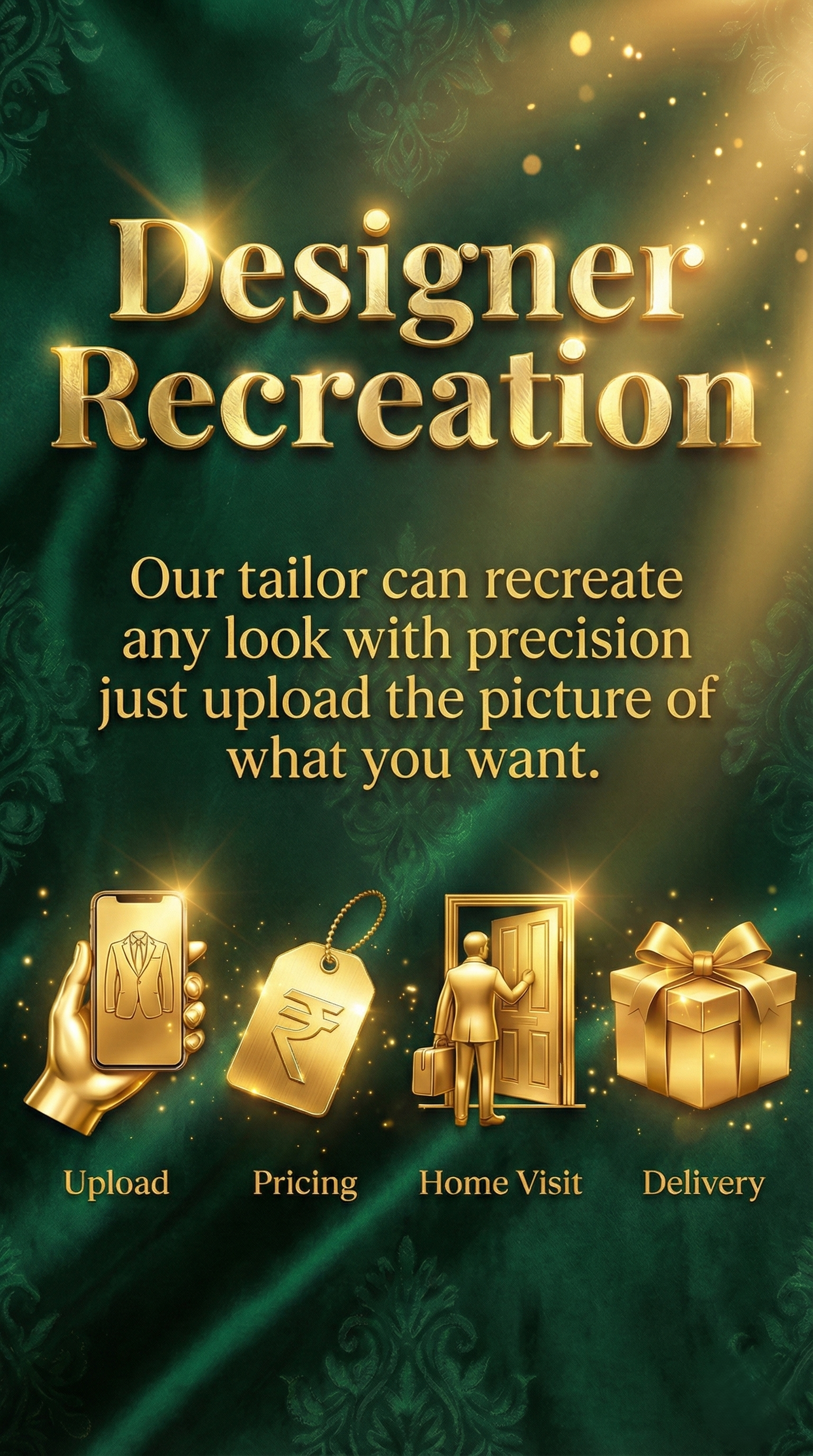 Experience custom tailoring at home with premium fabrics, expert measurements, and stitching done in 72 hours.
