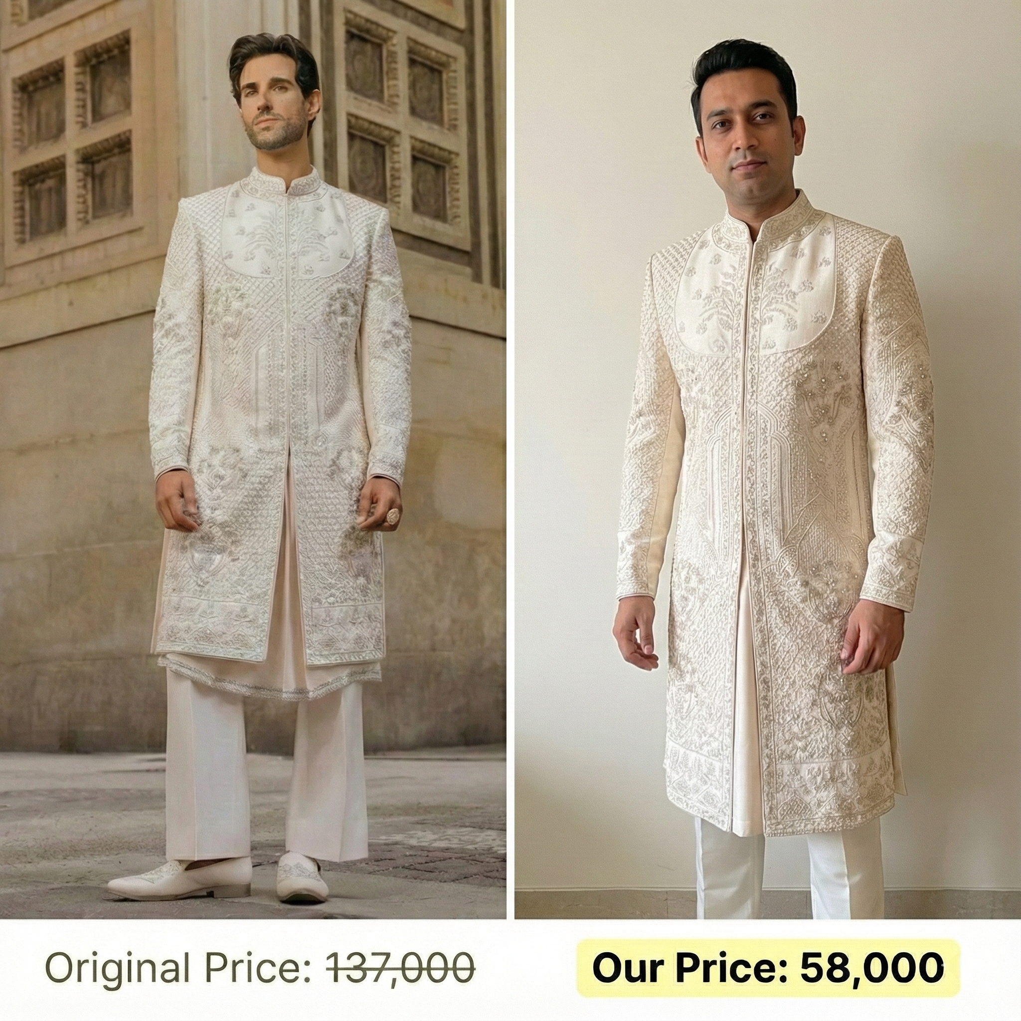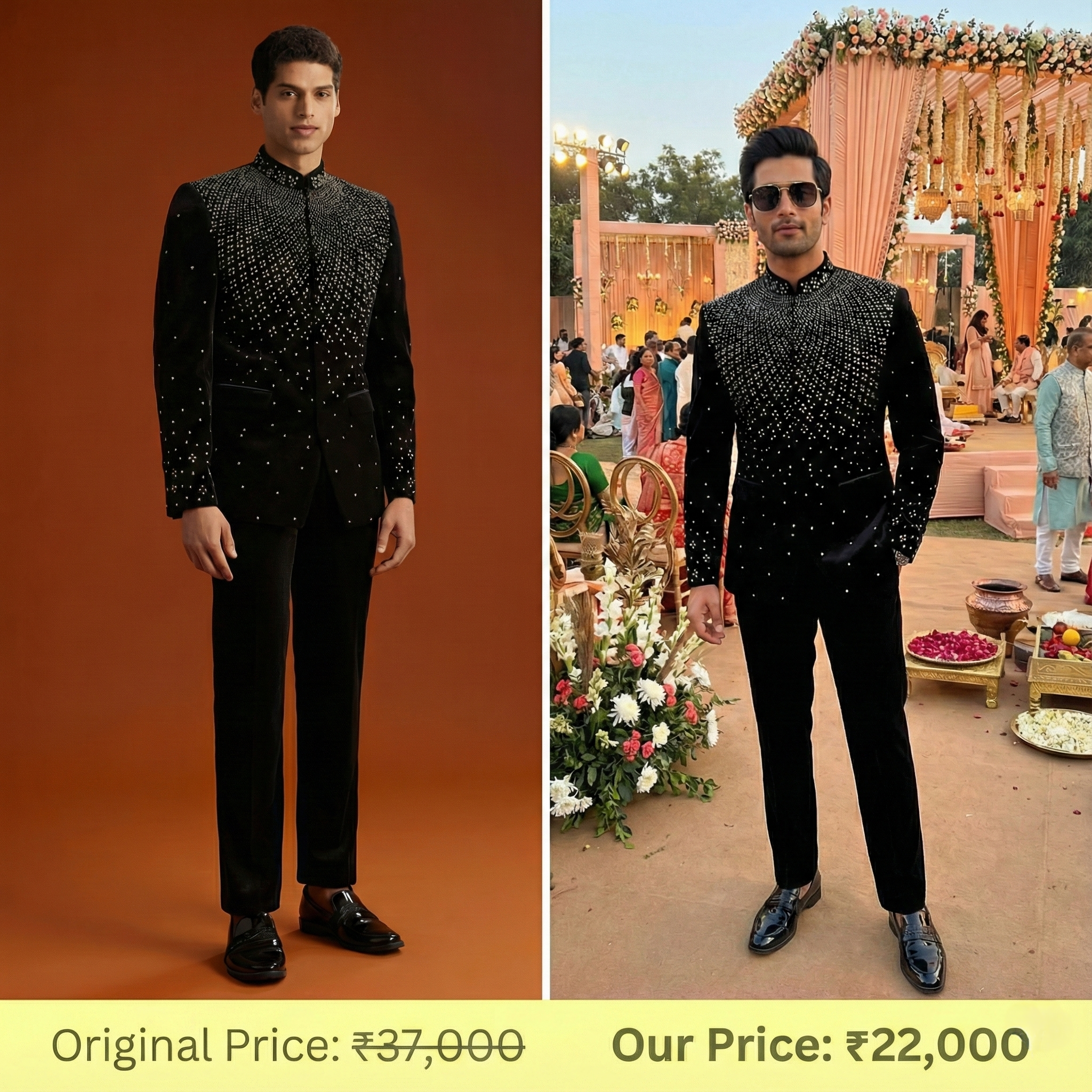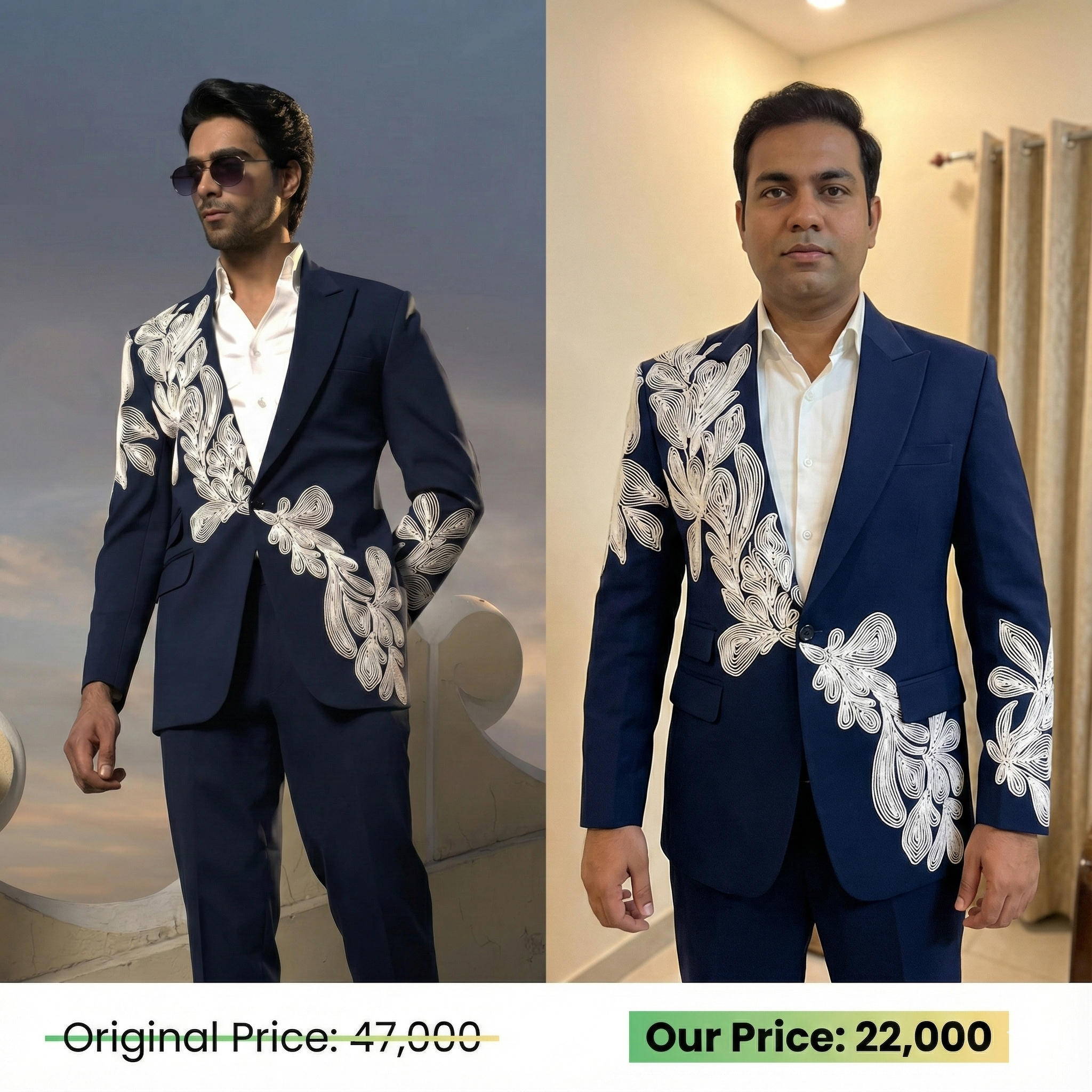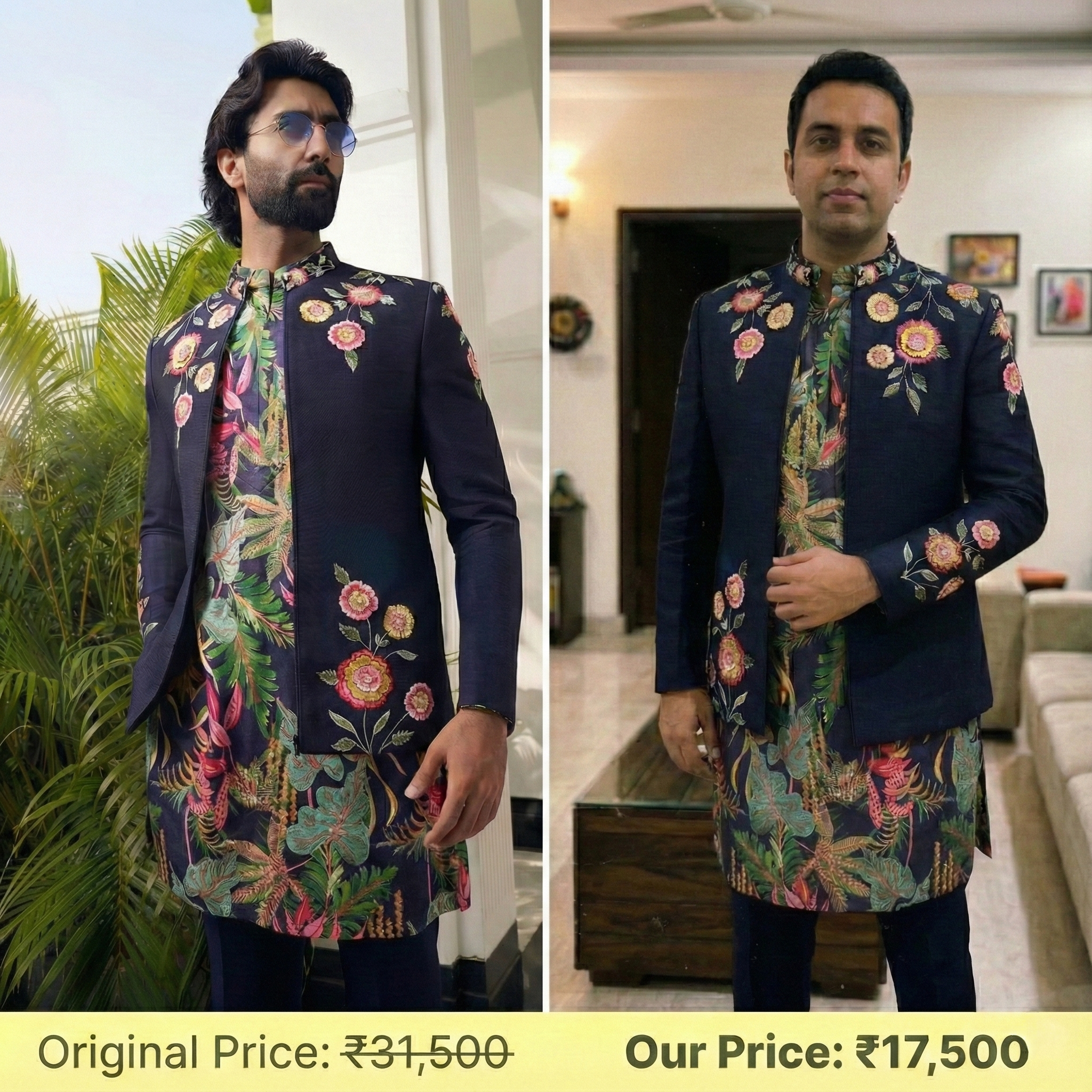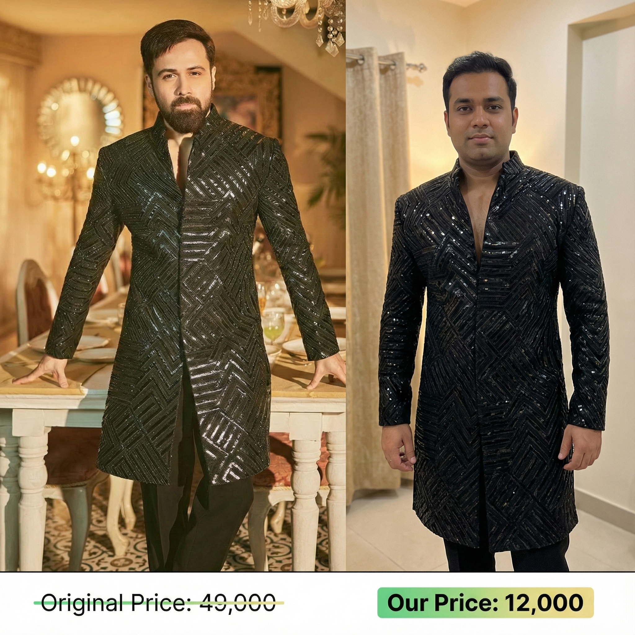 A modern indowestern recreated from the inspiration you share. Balanced, wearable, and stitched to look natural not overdone.